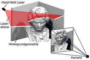 Benötigt werden nur eine einfache Kamera (z. B. Web-Cam) und ein Laser, der eine Linie in die aufzunehmende Szene projiziert. Beides ist heute für wenig Geld im Elektronikfachhandel erhältlich. Das zu scannende Objekt stellt man dann in eine Raumecke oder vor zwei Ebenen, die im rechten Winkel zueinander aufgestellt wurden, und richtet die Kamera auf das Objekt. Das besondere hierbei ist, dass man zum Scannen den Laser einfach in die Hand nimmt und die Laserlinie manuell über das Objekt wandern lässt. Mit der Software vom Institut für Robotik werden dann zeitgleich 3D-Daten generiert und am Bildschirm des Computers angezeigt. Auf diese Weise kann man die Laserlinie (wie einen virtuellen Pinsel) solange über das Objekt streifen lassen, bis man mit dem Ergebnis zufrieden ist. Um ein vollständiges 360°-Rundum-Modell zu erhalten, kann die Software außerdem mehrere Scans aus verschiedenen Sichtrichtungen automatisch "zusammenpuzzeln".