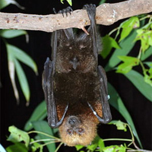 Abb. 1: Ruhender Rodrigues-Flughund (Pteropus rodricensis), eine der untersuchten Arten. Man beachte die recht großen, nach vorn gerichteten Augen.